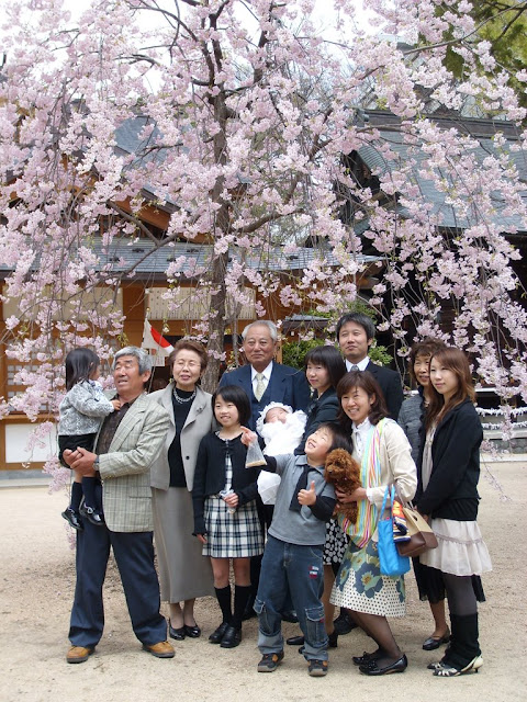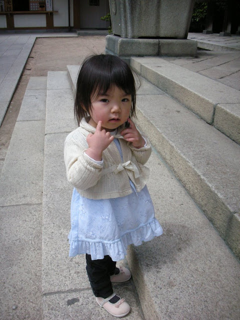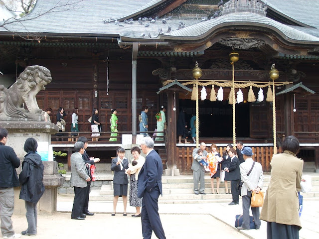 逛了差不多1小時,朋友買了個手袋。準備離開時又被那四柱神社吸引住,似乎有不少人在行甚麼祭禮。走近一看,原來是一對對的父母跟家人帶著自己的初生孩子來行不知甚麼祭禮。有些穿著西服,有些就穿著傳統和服,周遭也有不少來恭賀的親朋戚友們。